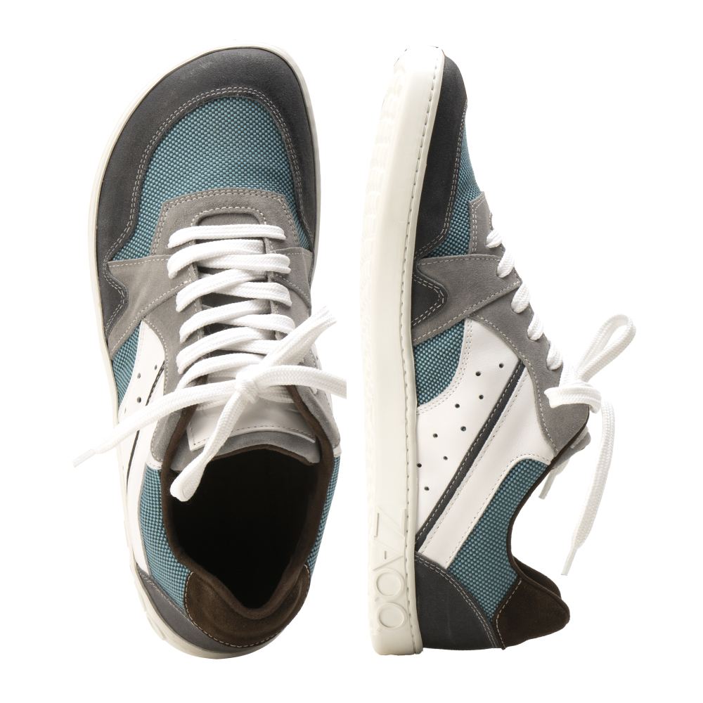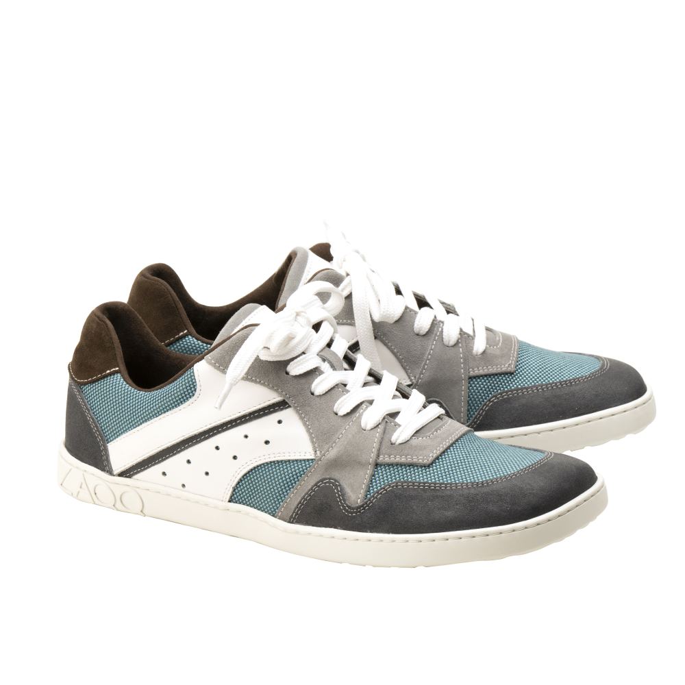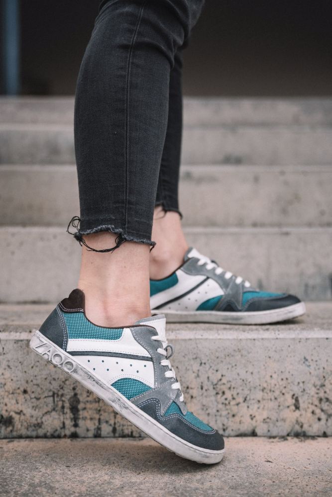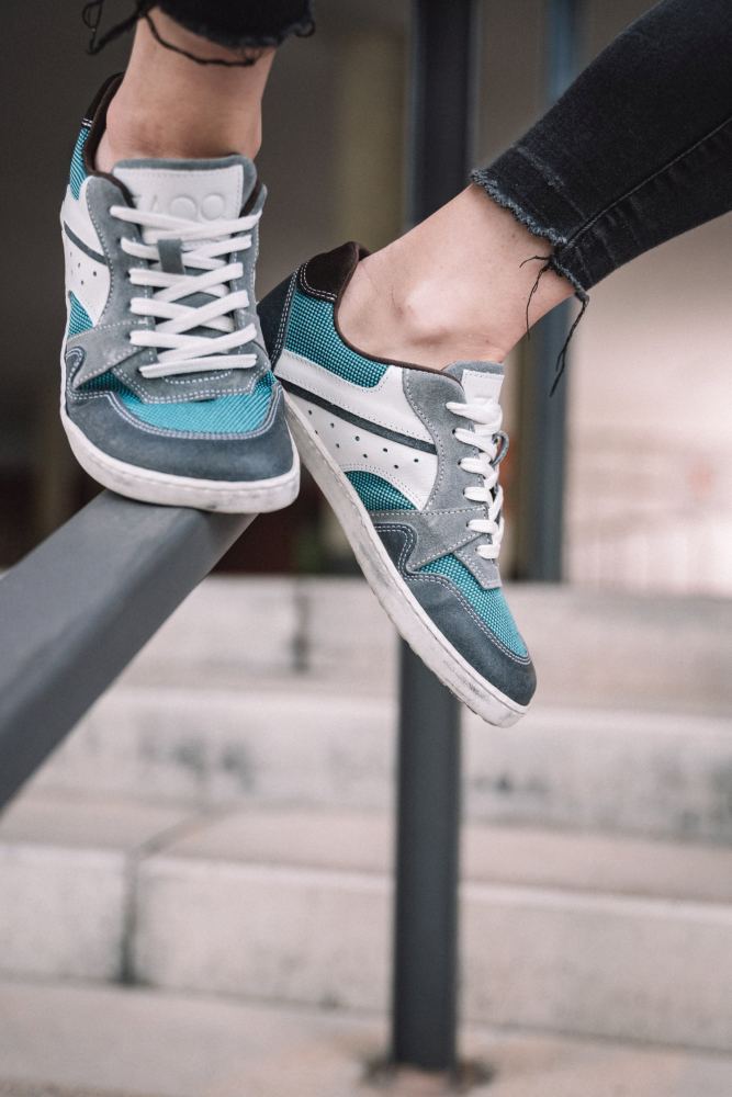 Několik barev, několik materiálů, ale všechno dokonale koordinovalo! Tkáň tyrkysové sítě byla přerušena velur a koženou kůži. Výsledný vzorec vizuálně natahuje botu naboso.