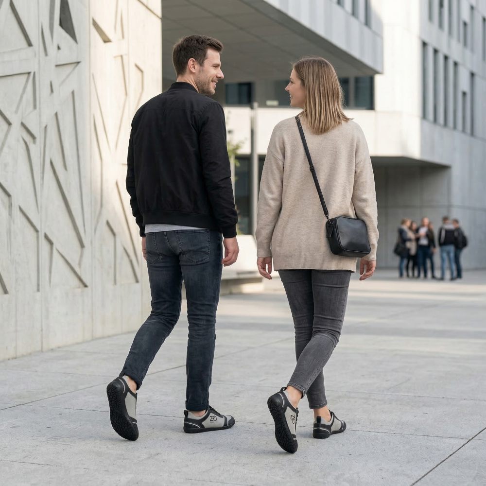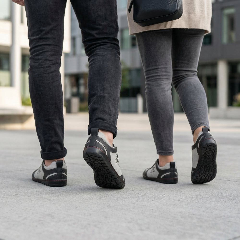 Venkovní gumová podešev s nulovou patou, tím uvolňuje páteř a chrání klouby, podporuje přirozené držení těla