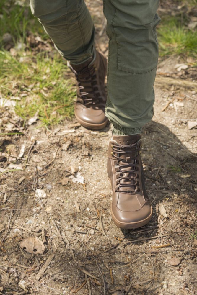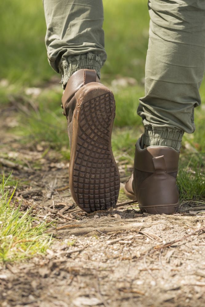 Gumová podešev s nulovou patou, tím uvolňuje páteř a chrání klouby, podporuje přirozené držení těla